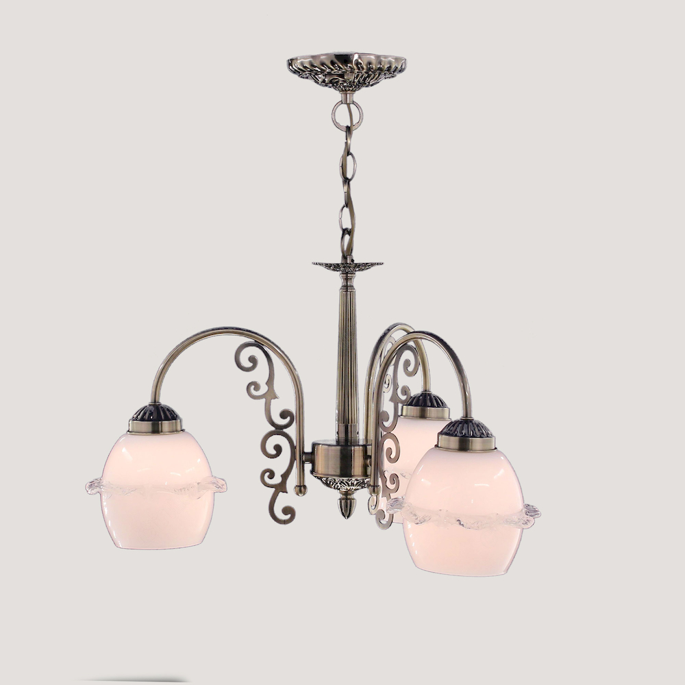 Диаметр 52 см, Высота 43-78 см (с цепью), Возможность сборки люстры в потолочном варианте без цепи, Художественное стекло с фигурной "юбочкой".