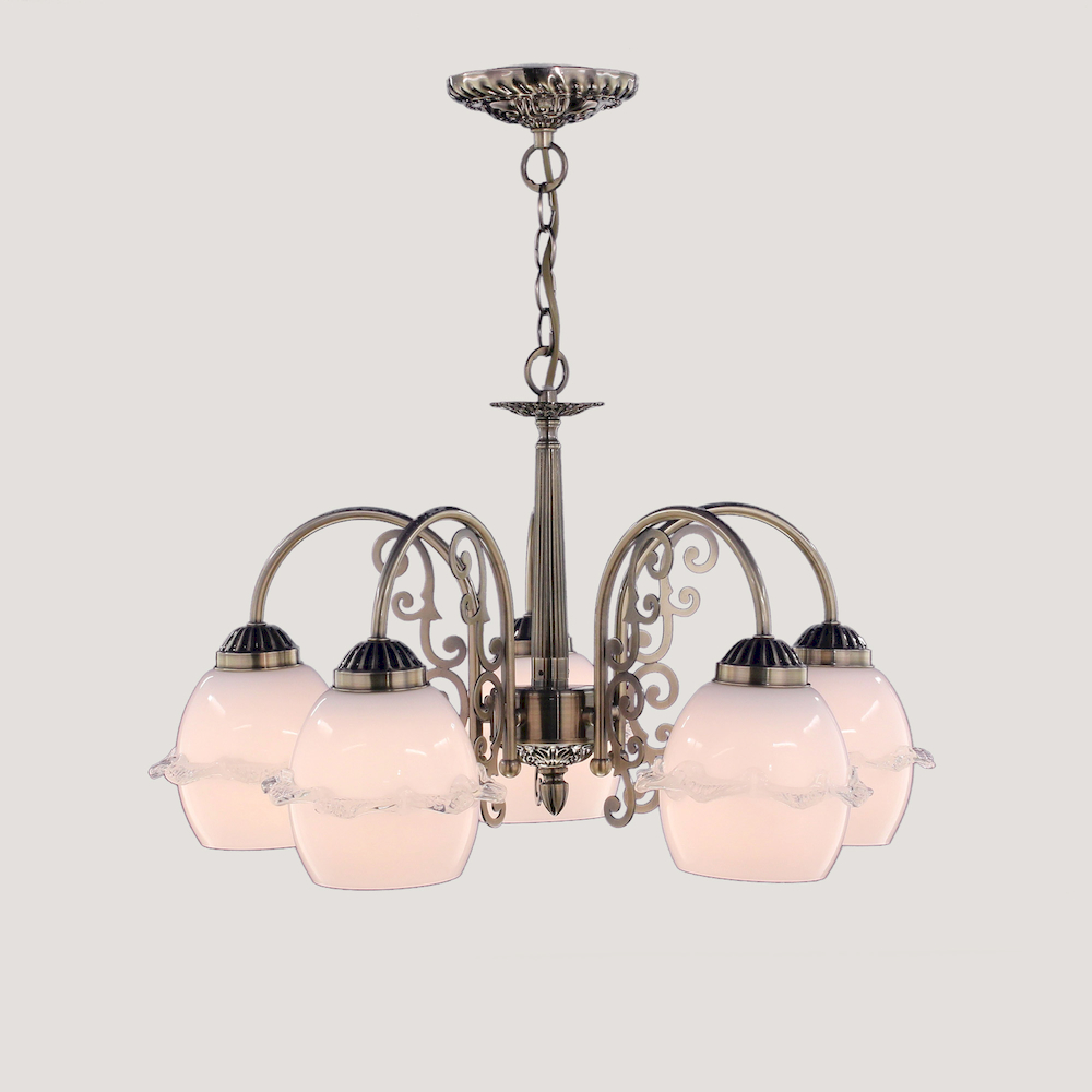 Диаметр 52 см. Высота 43-78 см(с цепью), Возможность сборки люстры в потолочном варианте без цепи, Художественное стекло с фигурной "юбочкой".