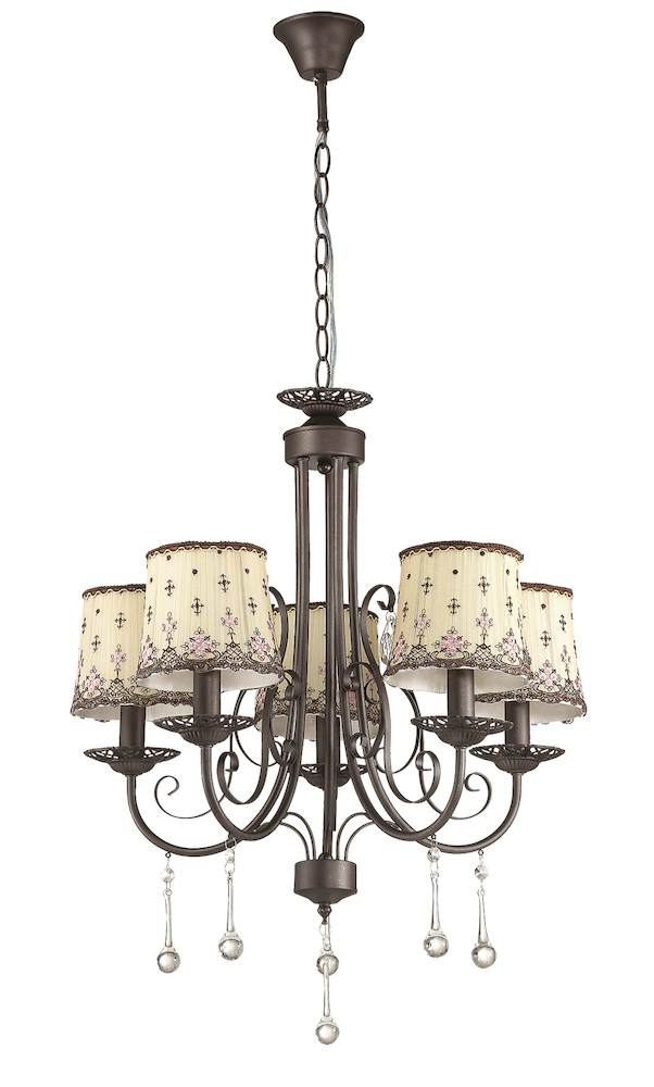 Люстра 3054/5 серии Calma оформлена в классическом стиле. Люстра состоит из тканевых абажуров пастельных тонов с цветочным принтом, украшенных ажурной тесьмой и арматуры благородного кофейного цвета. Хрустальные и стеклянные подвески придают особую изящность модели. Цоколь E14. Мощность 5x40W. Нет ламп в комплекте.