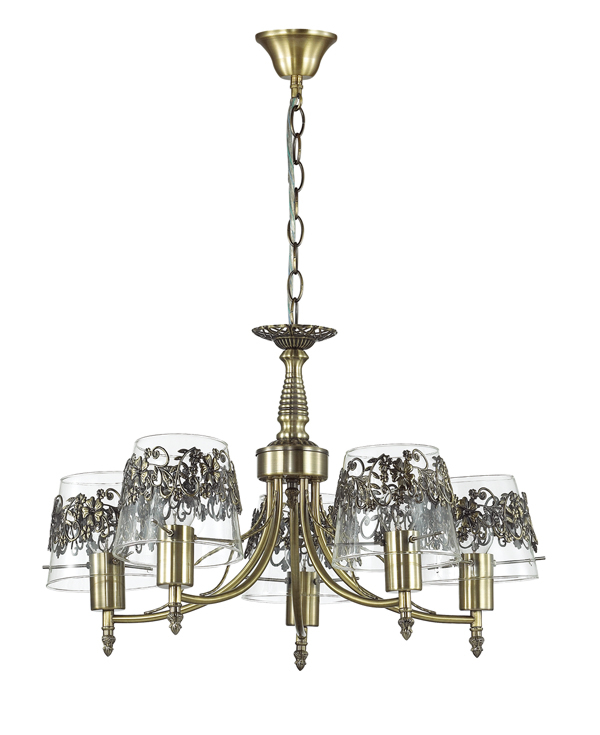 Люстра 3051/5 серии Colombina оформлена в классическом стиле. Люстра потолочная состоит из прозрачных плафонов с ажурным металлическим декором, а также изящной арматуры цвета бронзы. Модель несомненно украсит любой классический интерьер. Цоколь E14. Мощность 5х40W. Нет ламп в комплекте.