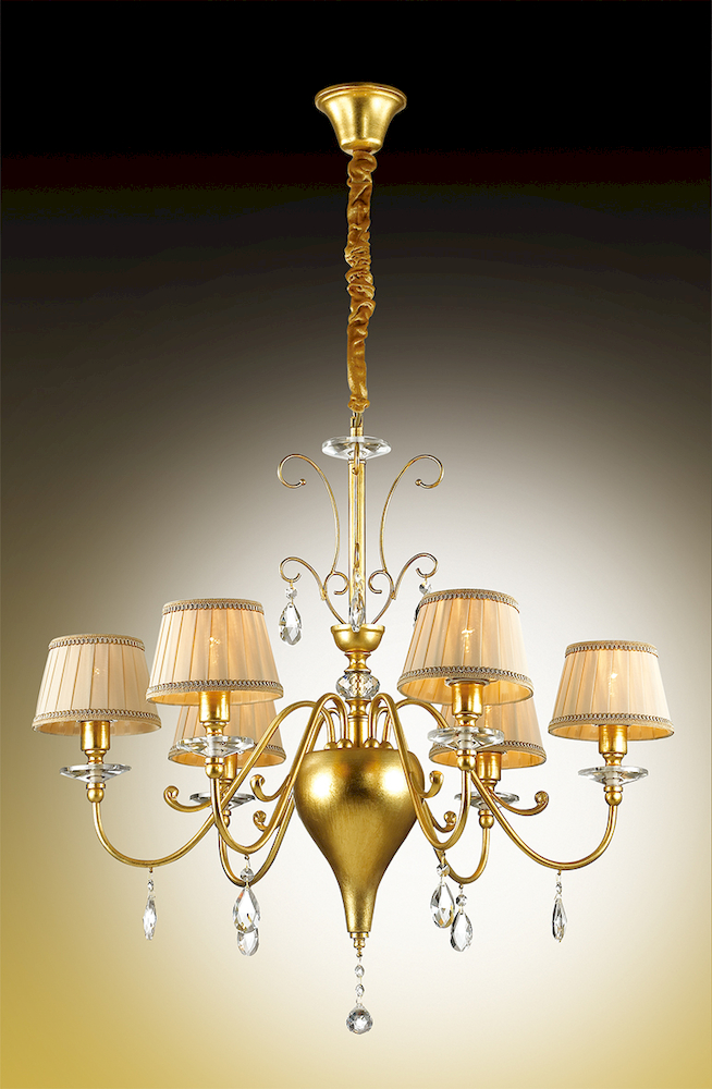 Люстра 2937/6 серии Alpes выполнена в золотом цвете. Абажур из светлой ткани, декоративные элементы выполнены в виде хрустальных подвесок. Цоколь Е14. Мощность 6х40W. Тип крепления "крюк". Нет ламп в комплекте.