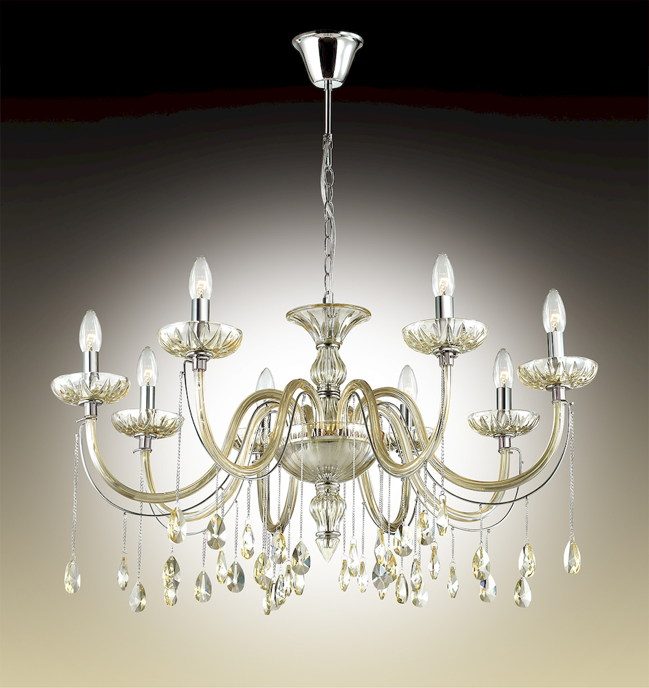 Люстра 2911/8 серии Alvada выполнена в классическом стиле. Покрытие люстры цвета хром, рожки декорированы янтарным стеклом и подвесками из хрусталя. Цоколь Е14. Мощность 8х40W. Тип крепления "крюк". Нет ламп в комплекте.