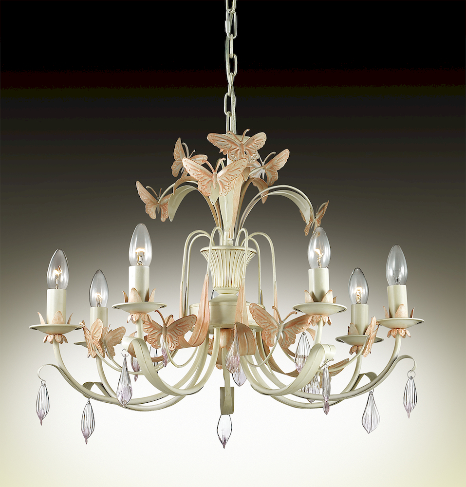 Люстра 2895/7 серии Fera выполнена в кремовом цвете. Изящный, воздушный декор в виде металлическиx бабочек, хрустальные подвески по периметру. Цоколь Е14. Мощность 7х60W. Тип крепления "крюк". Нет ламп в комплекте.