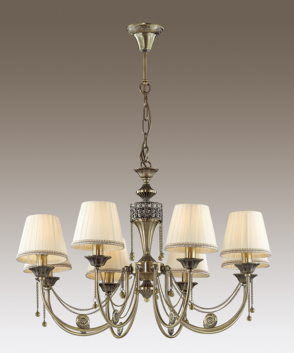 Люстра 3222/8 серии IGNESSA оформлена в классическом стиле. Люстра состоит из бронзовой арматуры, украшенной металлическими декоративными элементами и цепочками, и тканевых абажуров пастельных тонов с декоративной тесьмой. Роскошная и элегантная, данная модель не оставит равнодушным ни одного ценителя классики. Цоколь E14. Мощность 8*40W. Нет ламп в комплекте.