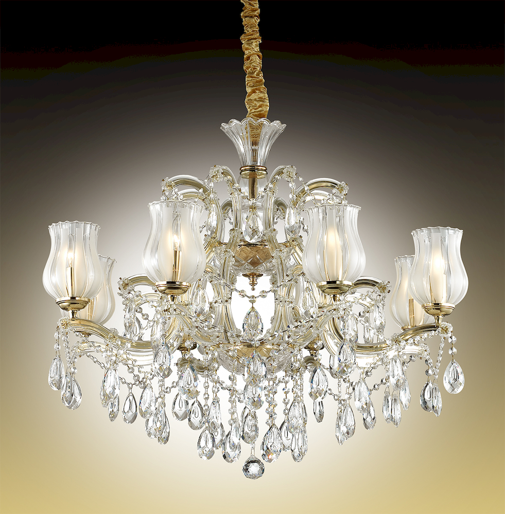 Люстра 2936/8 серии Mount выполнена в классическом стиле. Покрытие люстры золотого цвета, плафон из стекла, рожки декорированы прозрачным стеклом и подвесками из хрусталя. Цоколь Е14. Мощность 8х40W. Тип крепления "крюк". Нет ламп в комплекте.