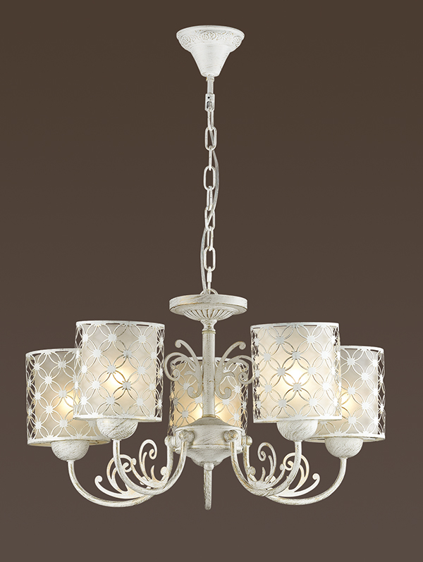 Люстра 3276/5 серии NADINE оформлена в классическом стиле. Люстра состоит из стеклянных плафонов, ограненных металлическим резным стаканчиком и белой с золотой патиной арматуры, украшенной ажурными металлическими элементами. Данная модель окунет Вас в старые добрые времена смелых рыцарей и прекрасных леди. Цоколь E27. Мощность 5*60W. Нет ламп в комплекте.