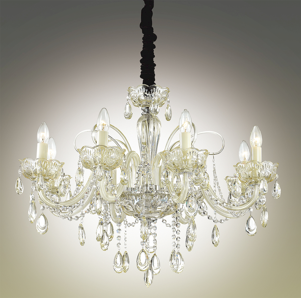 Люстра 2938/8 серии Remena оформлена в классическом стиле. Вензеля из бежевого стекла и множество хрустальных подвесок придают данной моделе роскошь исполнения, цвет покрытия базы хром. Рекомендуем исползовать лампочки типа "свеча на ветру". Цоколь Е14. Мощность 8x40W. Тип крепления "крюк". Нет ламп в комплекте.