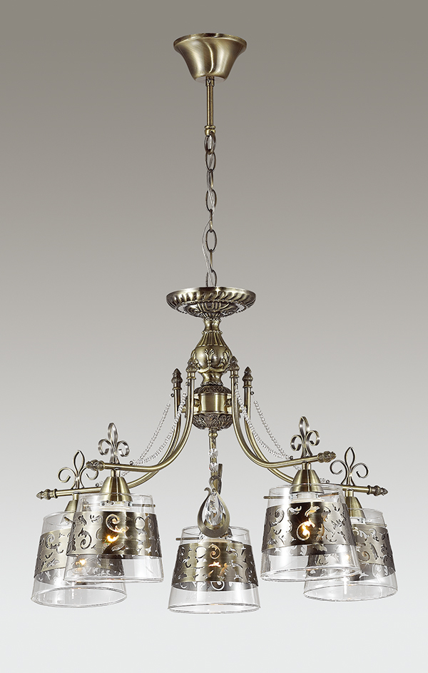Люстра 3127/5 серии SANSA оформлена в классическом стиле. Люстра состоит из бронзовой арматуры и стеклянных плафонов, украшенных резным металлическим декором. Экстравагантная и изящная, оригинальная и изысканная, данная модель великолепно дополнит любой интерьер. Цоколь E14. Мощность 5*40W. Нет ламп в комплекте.