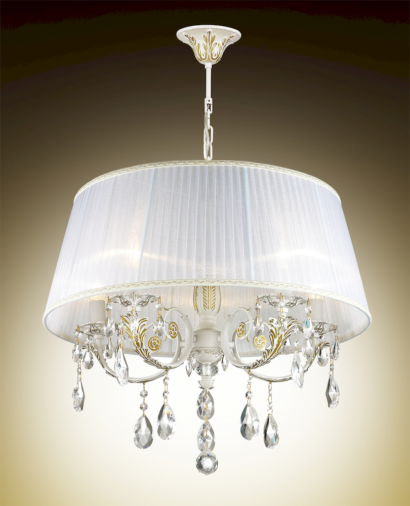 Люстра 2913/5 серии Tivola выполнена в классическом стиле. Покрытие белого цвета декорировано золотом, большой тканевый абажур из прозрачной органзы и завершают классический образ хрустальные подвески. Цоколь Е14. Мощность 5х40W. Тип крепления "крюк". Нет ламп в комплекте.