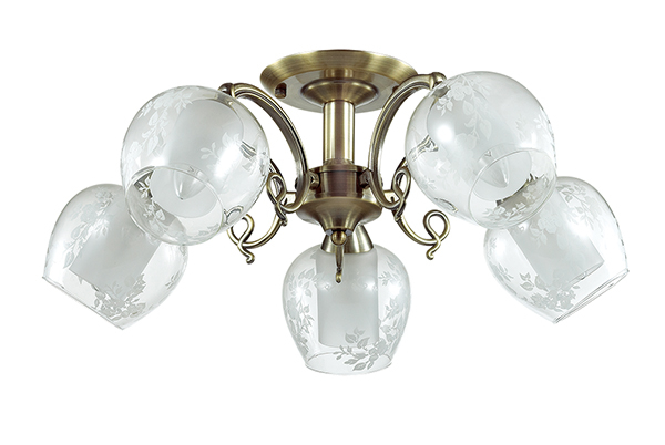 Люстра потолочная 3107/5C серии Velia оформлена в классическом стиле. Светильник состоит из двойных плафонов, нижняя часть которых - молочно-матовая, а врехняя - прозрачная с вензельным рисунком, и незатейливой арматуры бронзового цвета. Данная модель будет незаменимой в небольших комнатах в классическом стиле. Цоколь E14. Мощность 5x60W. Нет ламп в комплекте.