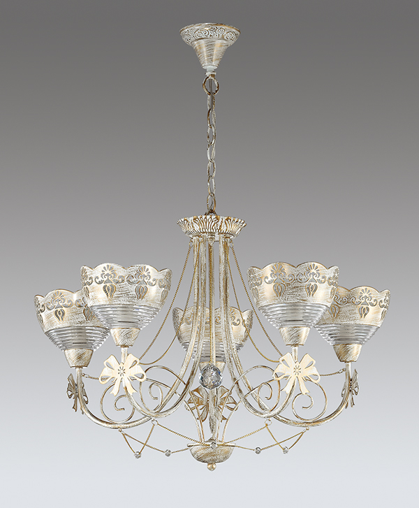 Люстра потолочная 3143/5C серии FARFALLA оформлена в классическом стиле. Люстра состоит из роскошных плафонов, состоящих из стекла с тиснением и металлической части с ажурным узором, и белой с золотой патиной арматуры, украшенной металлическими декоративными элементами в виде бантиков и цепочками с жемчужными бусинками. Нежная, изящная, пленительная модель. Цоколь E27. Мощность 5*60W. Нет ламп в комплекте.