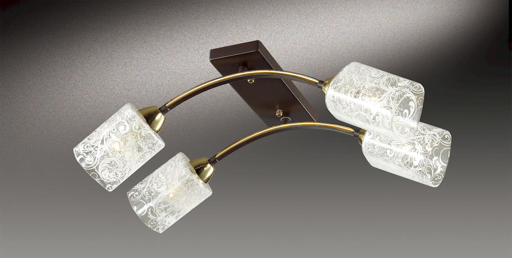 Люстра 2941/4С серии Nantes выполнена в коричневом цвете с золотым декором. Стеклянные абажуры потолочной люстры украшены ажурным рисунком. Цоколь Е14. Мощность 4х60W. Нет ламп в комплекте.