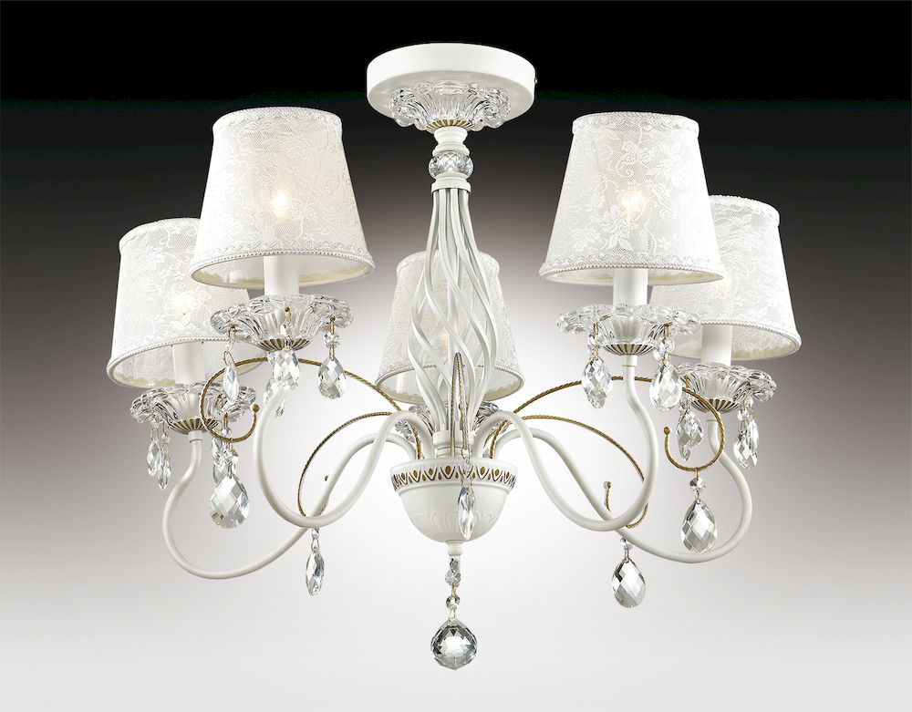 Люстра 2922/5С серии Talsano выполнена в белом цвете с позолотой. Светлый тканевый абажур потолочной люстры украшен ажурным рисунком, декоративные элементы выполнены в виде хрустальных подвесок. Цоколь Е14. Мощность 5х40W. Нет ламп в комплекте.