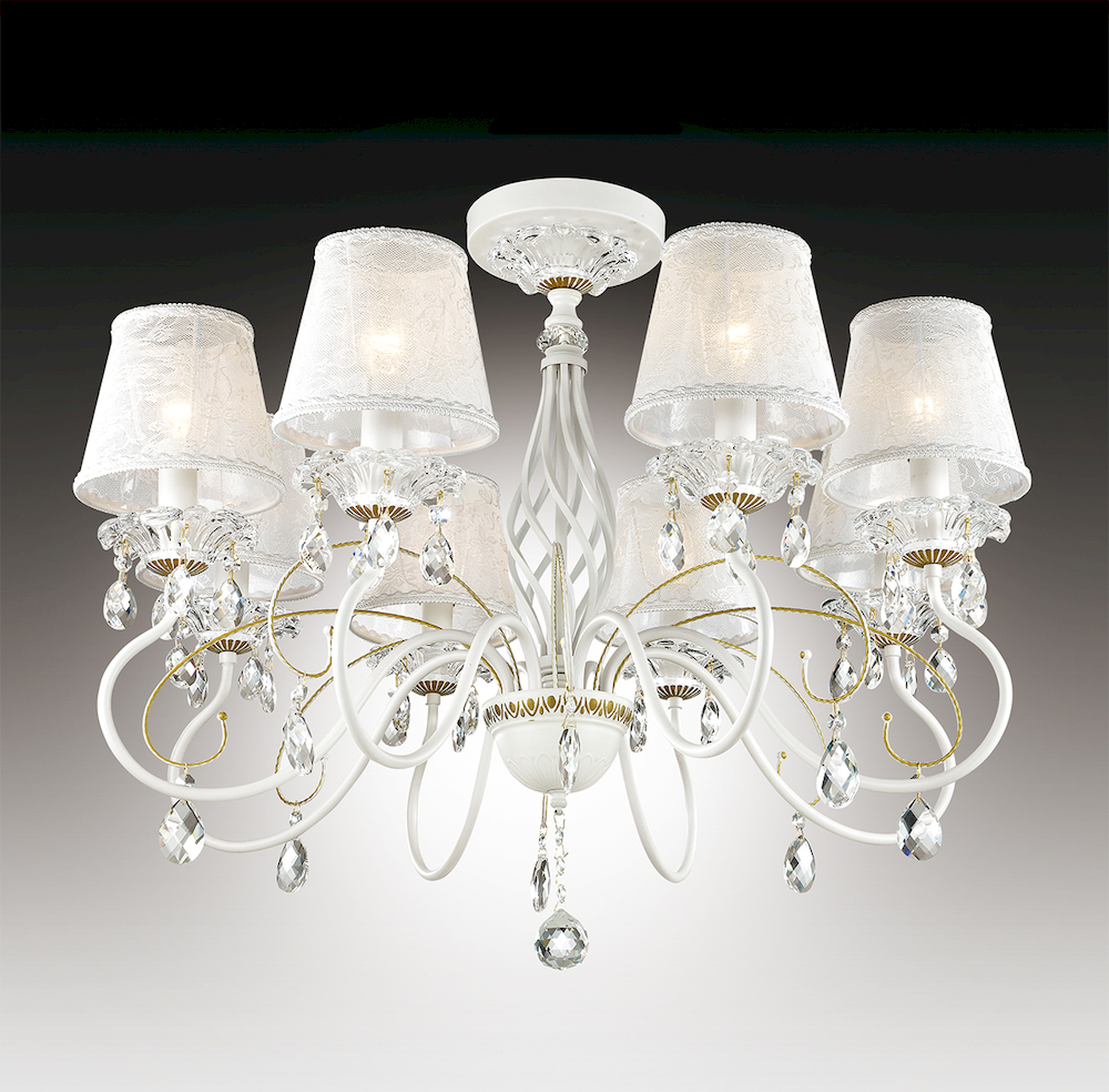 Люстра 2922/8С серии Talsano выполнена в белом цвете с позолотой. Светлый тканевый абажур потолочной люстры украшен ажурным рисунком, декоративные элементы выполнены в виде хрустальных подвесок. Цоколь Е14. Мощность 8х40W. Нет ламп в комплекте.