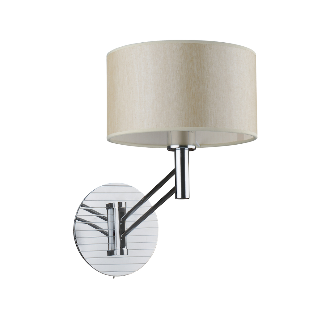 металл цвета хром, тканевый абажур из бежевого хлопка, с выключателем