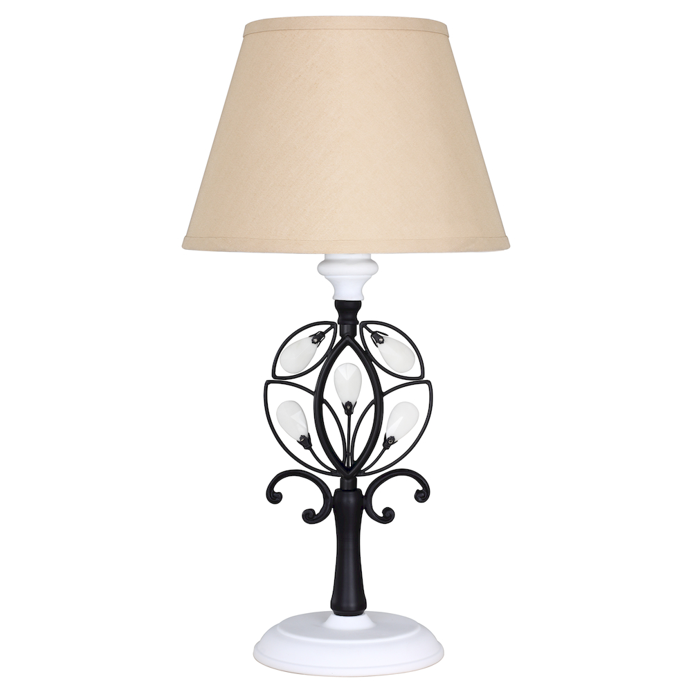 каркас окрашен в черный цвет с декоративными элементами белого цвета, тканевые абажуры из бежевого хлопка с фактурой рогожки, белый хрусталь