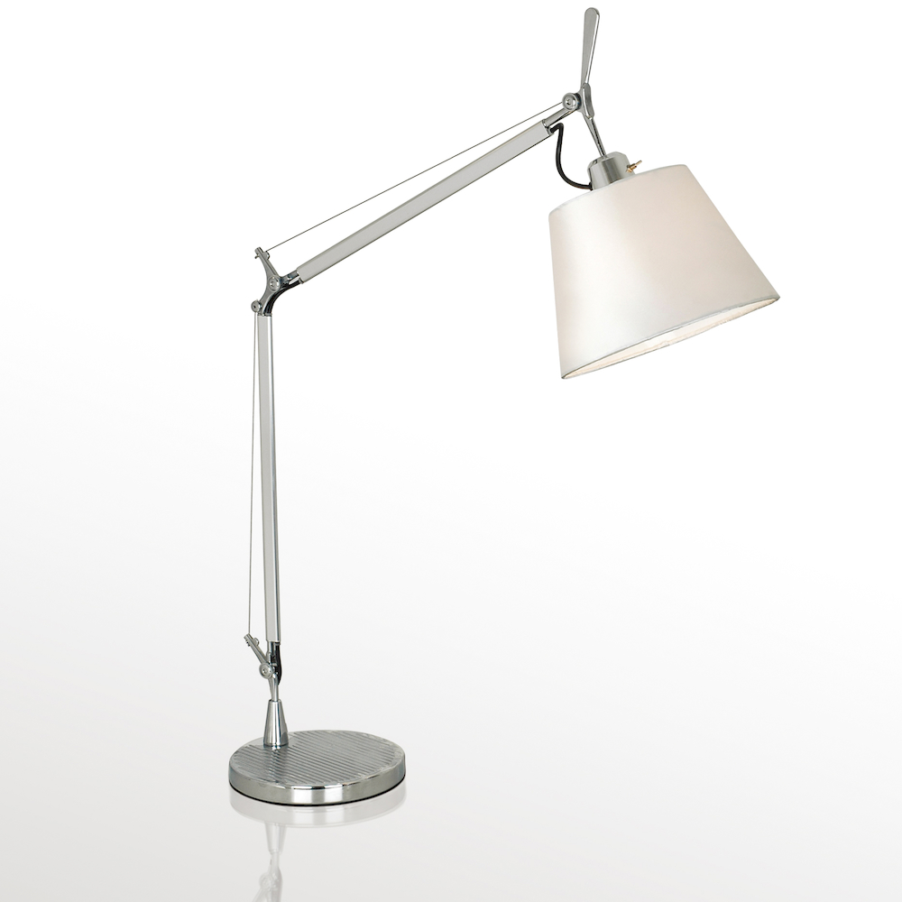 металл окрашен в серебряный цвет, абажур из белой ткани, двухступенчатая система сгибания основания