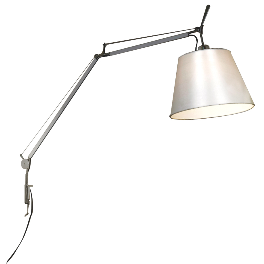 металл окрашен в серебряный цвет, абажур из белой ткани, трехступенчатая система сгибания основания
