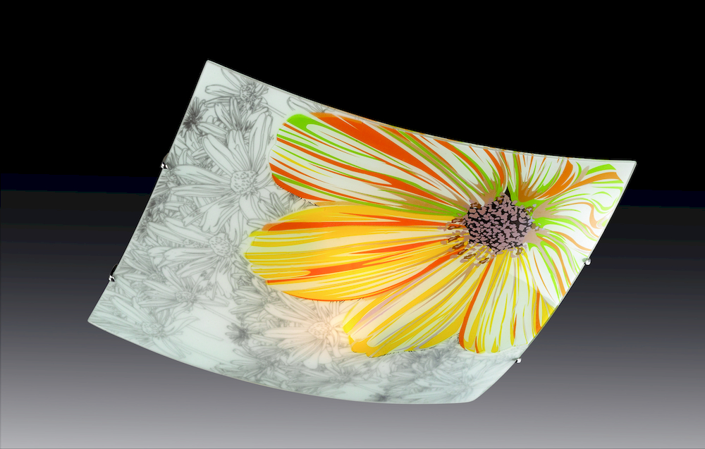 держатель плафона - никель, матовый белый плафон с жёлто-зеленым рисунком