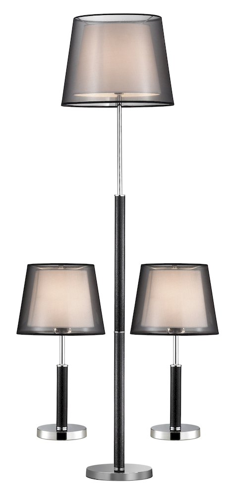 двойной абажур из тонкой черной органзы снаружи и белой ткани внутри, черная экокожа, металл хром