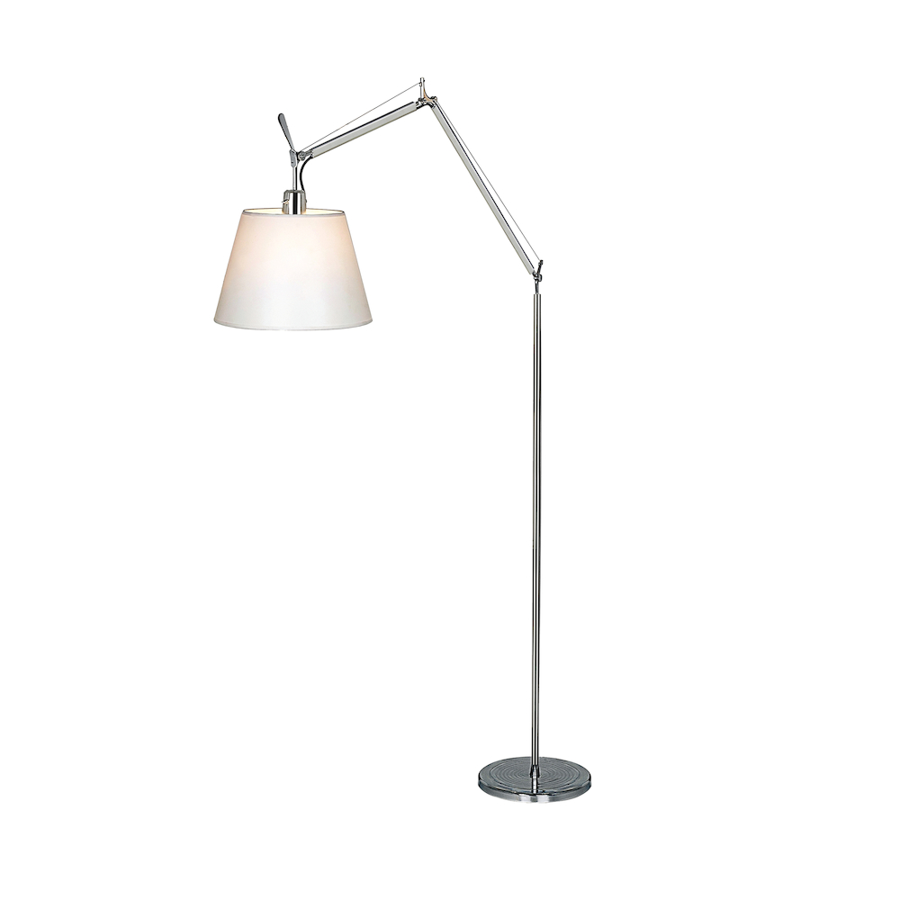 металл окрашен в серебряный цвет, абажур из белой ткани, трехступенчатая система сгибания основания